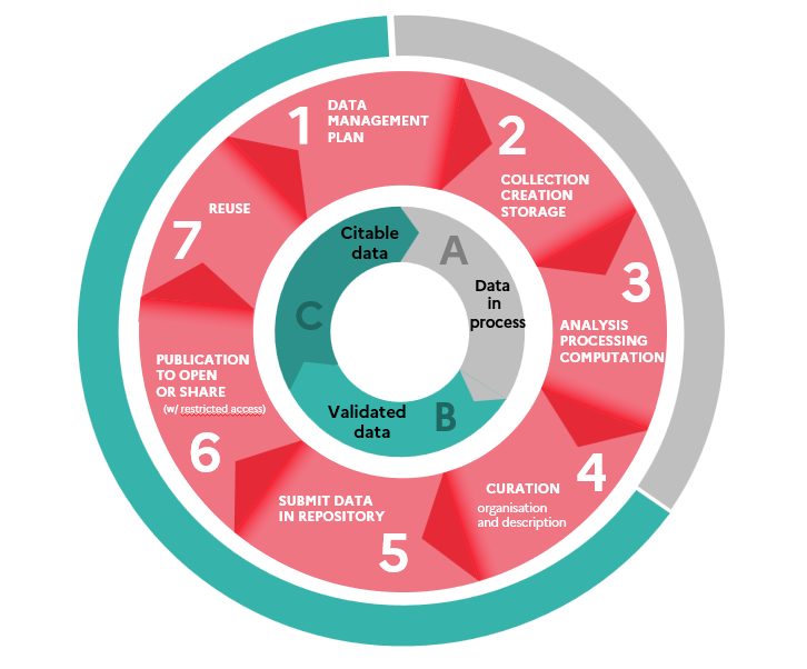 The first third of this cycle covers the stages of data collection, creation, storage and processing which are all aimed at producing scientifically validated data. These stages are worked on in laboratories using storage and calculation services. The Recherche Data Gouv data repository does not represent a storage solution for data that are still being processed.